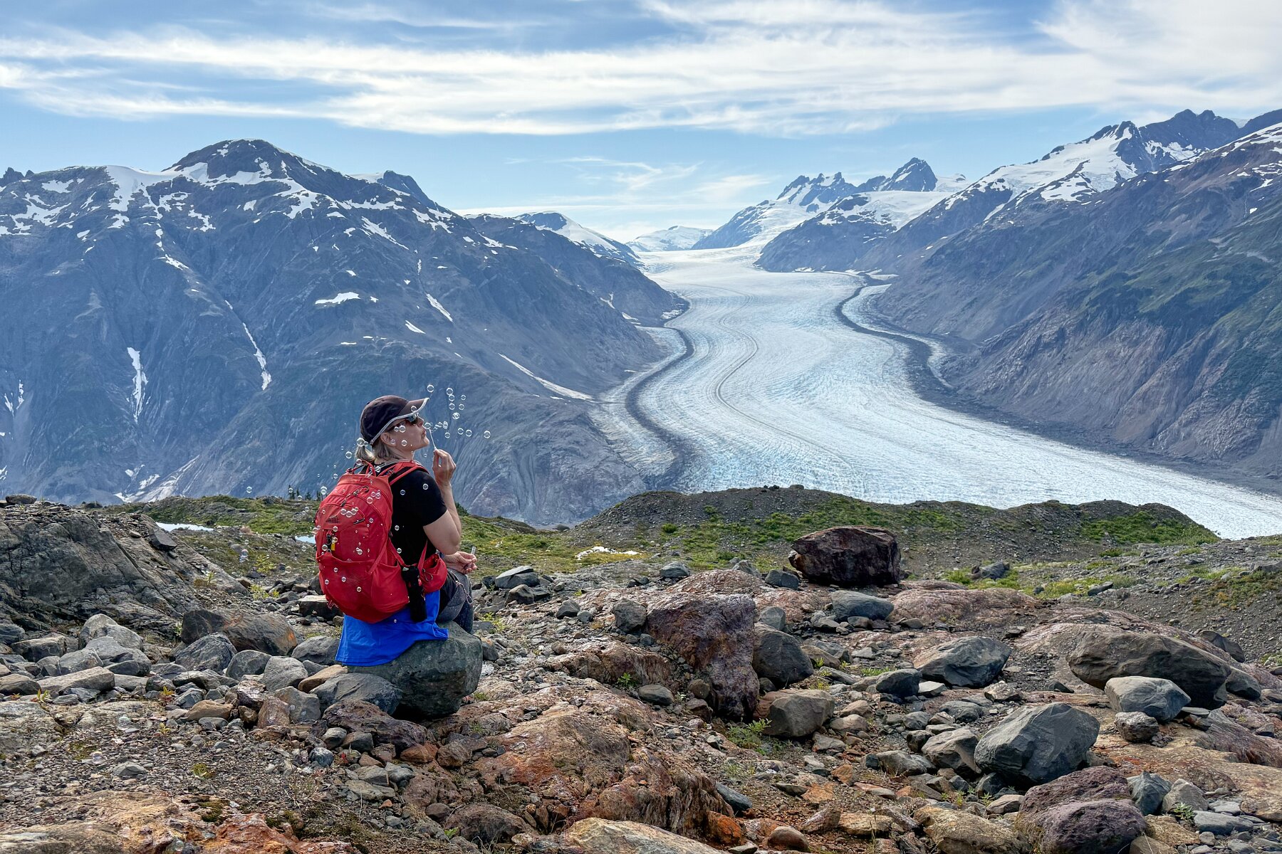 Eventually though we made it to Stewart, BC and then just across the border and through Hyder, Alaska to a camping area near the Fish Creek Wildlife Observation Site after dark.  The recommended viewing times are at dusk and dawn but we showed up late the following morning and missed out on a sighting, not realizing that Hyder was an hour ahead of British Columbia time.  However, we spent the day following the dirt road north to admire the massive Salmon Glacier and do some hiking.