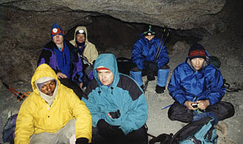 A few minutes shelter from the wind at the halfway point, Hans Meyer Cave.